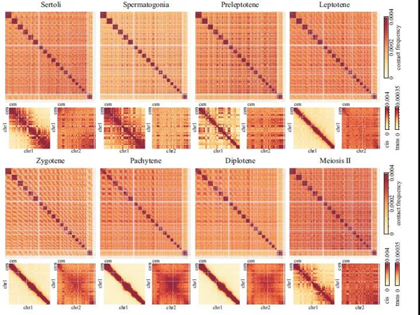 该论文利用FCM和Hi-C技术,系统地绘制了小鼠精子发生过程中所有减数分裂前期亚阶段(精原干细胞、细线期前期、细线期、偶线期、粗线期、双线期、次级精母细胞)的3D基因组结构,揭示了在减数分裂前期发生同源排列时,沿着染色体轴的两个主要染色体组织特征的变化。一是转录活性和非活性基因组区域形成交替结构域,分别由较短和较长的染色质环组成。二是力传递LINC复合体促进不同染色体末端的排列,其长度范围可达染色体长度的20%。这两个特征都与染色体同源相互作用的模式和重组事件的分布有关。该研究表明转录活性和机械力在减数分裂过程中对染色体高级结构具有重要的调控功能,能够促进同源配对和联会的形成,为进一步理解减数分裂与有性生殖的分子机制提供了新的线索。