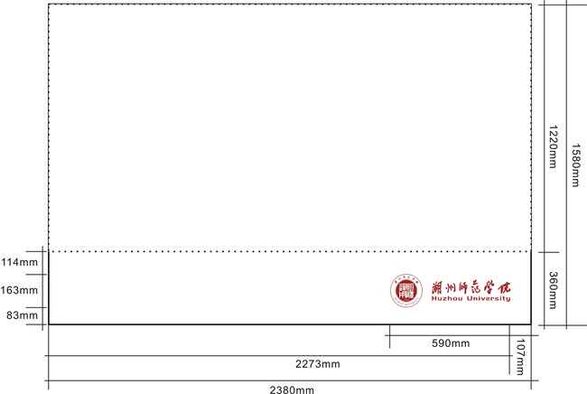 二级学院的旗帜尺寸,长为2380毫米,宽为1580毫米。各学院和部门在使用校旗时要以上图为标准,校徽和中英文全称在右下角,使用时不得超出虚线范围之外,虚线区域内可以根据实际进行自由安排。